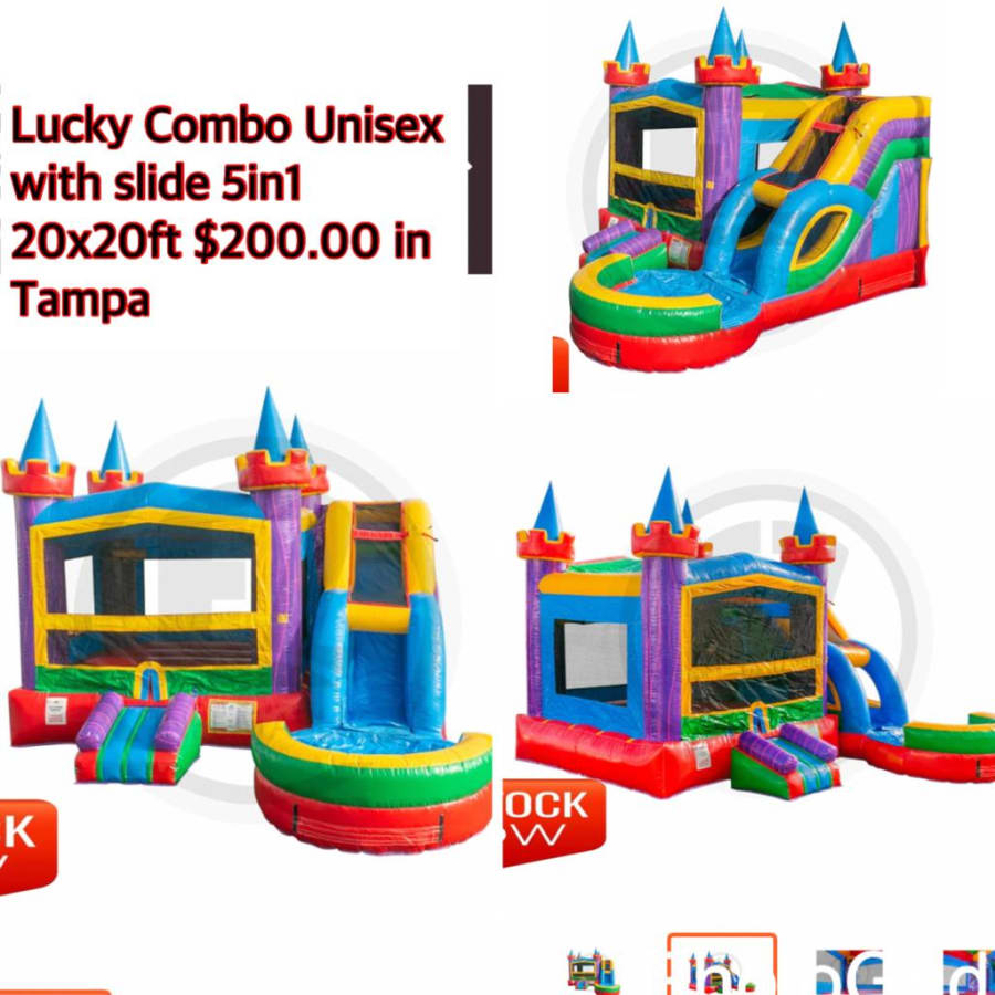 We offer delivery of the 20x20x14 ft 5 in 1 Lucky Combo Unisex with Slide to the following areas: Tampa, Wesley Chapel, Lutz, Land O Lakes, New Port Richey, Hudson, Holiday, Dunedin, Palm Harbor, Odessa, Oldsmar, Brandon, Valrico, Lithia, Dover, Riverview, Thonotosassa, Largo, Clearwater, St. Pete, Pinellas, and Seminole.
