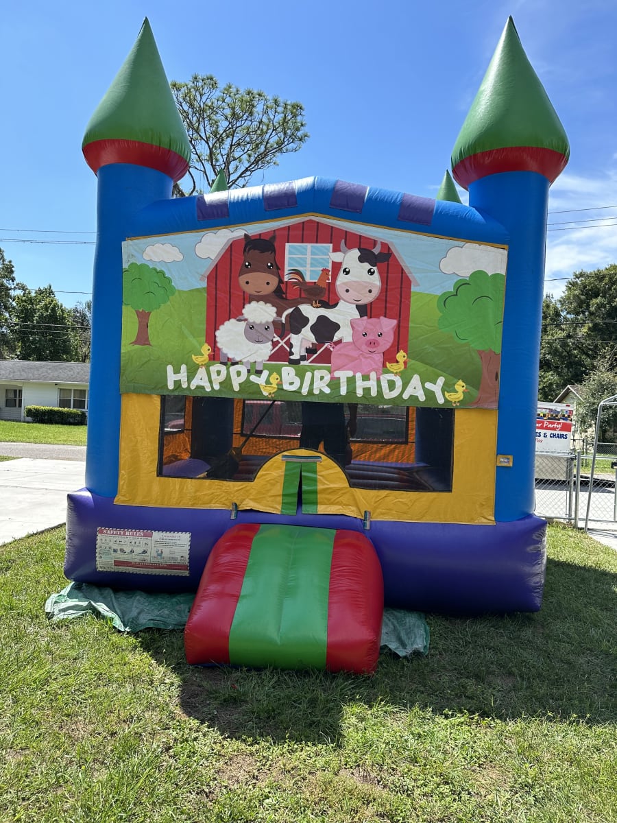 🚚 We offer delivery of the 13x13 ft Happy Birthday Farm bounce house to various areas, including Tampa, Wesley Chapel, Lutz, Land O Lakes, New Port Richey, Hudson, Holiday, Dunedin, Palm Harbor, Odessa, Oldsmar, Brandon, Valrico, Lithia, Dover, Riverview, Thonotosassa, Largo, Clearwater, St Pete, Pinellas, and Seminole. Wherever your event is taking place, we've got you covered!